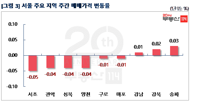 부동산114(www.r114.com)에 따르면 금주 서울 아파트 매매가격 변동률은 -0.01%로 집계됐다. 이는 작년 11월(11/16, -0.01%) 하락세로 돌아선 이후 가장 작은 낙폭을 기록한 것이다. 신도시와 경기ㆍ인천의 매매가격은 전주와 동일하게 각각 0.04%, 0.01% 떨어졌다. 전세가격은 서울이 0.02% 내려 전주(-0.07%) 대비 낙폭이 축소됐다. 신도시와 경기ㆍ인천은 각각 -0.02%, -0.05% 변동률로 약세를 이어갔다.