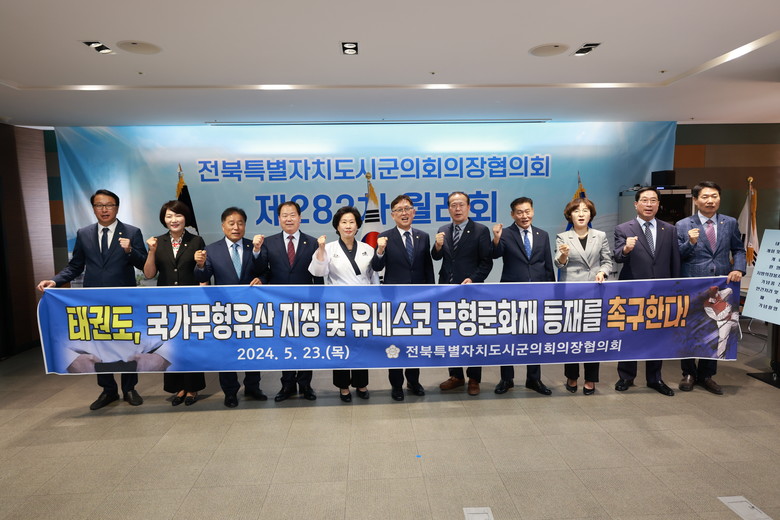 전북특별자치도시ㆍ군의회의장협의회(회장 이기동 전주시의회 의장)는 지난 23일 전주 한국전통문화전당에서 열린 제283차 월례회에서 이해양 의장이 제안한 「태권도, 국가무형유산 지정 및 유네스코 무형문화재 등재 촉구 건의안」을 만장일치로 채택했다.