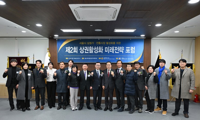 ▲ 지난 2월 14일 서울특별시의회 별관 제2대회의실에서 '제2회 상권활성화 미래전략 포럼'을 주최한 김용호 시의원(왼쪽 일곱 번째)이 내외빈과 단체 기념촬영을 하고 있다. |