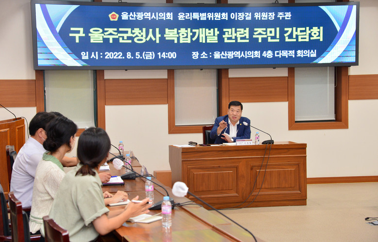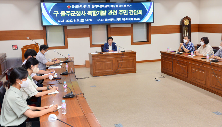 [울산 세계타임즈=이호근 기자] 울산광역시의회 이장걸 윤리특별위원장은 8월 5일 오후 2시, 시의회 4층 다목적회의실에서 ‘舊 울주군청사 복합개발에 따른 주민 의견 청취 간담회’를 가졌다.
