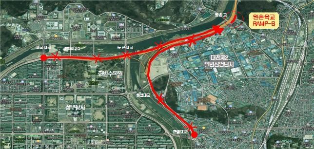 공사로 인한 통제구간은 한밭대로 진입부 ~ 원촌교 구간 및 문예지하차도(대덕대교) ~ 원촌육교 구간의 신탄진 방향 상행차로 전구간으로 3월 30일(18시)부터 4월 30일까지 전면 통제된다.
