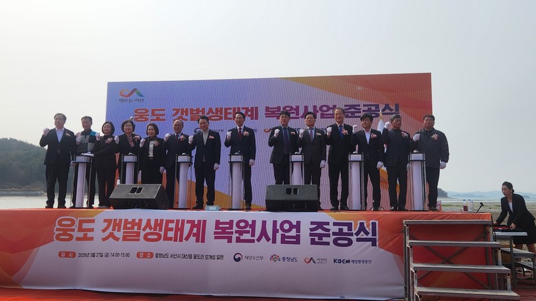 도는 27일 서산시 대산읍 웅도 모개섬 일원에서 이동유 도 해양수산국장과 황준성 해양수산부 해양환경정책관, 이완섭 서산시장, 관계기관, 주민 등 100여 명이 참석한 가운데 ‘웅도 갯벌생태계 복원사업 준공식’을 개최했다.