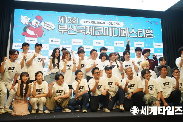 1일 서울 마포구 상암 스탠포드 호텔에서 진행된 제13회 '부산국제코미디페스티벌' 기자간담회에 참석한 출연 개그맨, 개그우먼들이 기념촬영을 하고 있다.