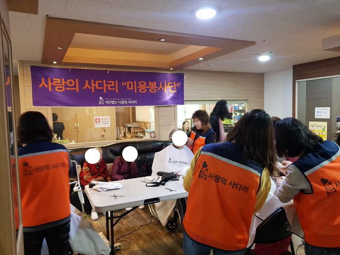 이날 미용봉사는 송남석 단장을 비롯해서 김미경 김보경 박소희 박유신 이미향 이하영 조은숙 조인숙 가위천사들이 1층, 3층, 별관에서 치매 및 와상 70명 어르신들에게 미용봉사를 하였다.
