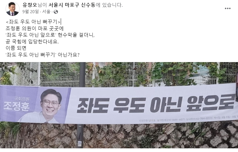 유창오 감사는 최근 22대 총선에서 마포갑 지역 출마를 염두해 두고 지역기반 다지기에 열중하고 있다는 지적이 있다. 조정훈 의원이 국민의힘 입당과 더불어 마포갑 출마설이 대두되고 있으며 현수막을 게첩한 것에 대해 페북을 통해 불편한 기색을 내비친 것으로 해석된다.