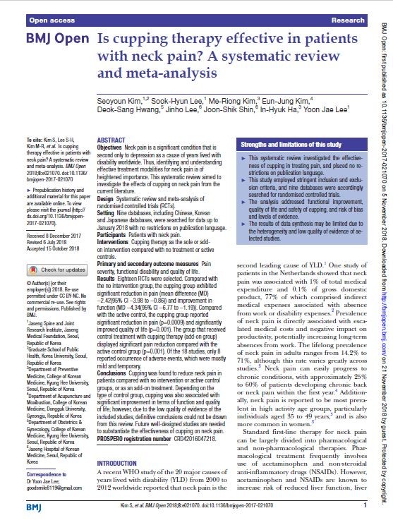 | ▲SCI(E)급 국제학술지 ‘BMJ Open’ 11월호에 게재된 해당 연구 논문 「Is cupping therapy effective in patients with neck pain? A systematic review and meta-analysis」 |