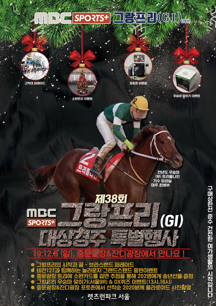 올해 대미를 장식하는 대상경주 ‘그랑프리’에 품격에 맞게 20명 규모 크라운 마칭밴드의 화려한 퍼레이드쇼가 펼쳐진다. 2020년 새해 소원을 적어 크리스마스트리에 걸면 추첨을 통해 202명에게 송년선물을 증정하는 ‘소원트리 이벤트’도 열린다. 또한 크리스마스 데코와 귀여운 말 캐릭터로 꾸며진 이색 포토존에서는 추억의 순간이 담긴 폴라로이드 사진을 선착순 2020명에게 증정한다.