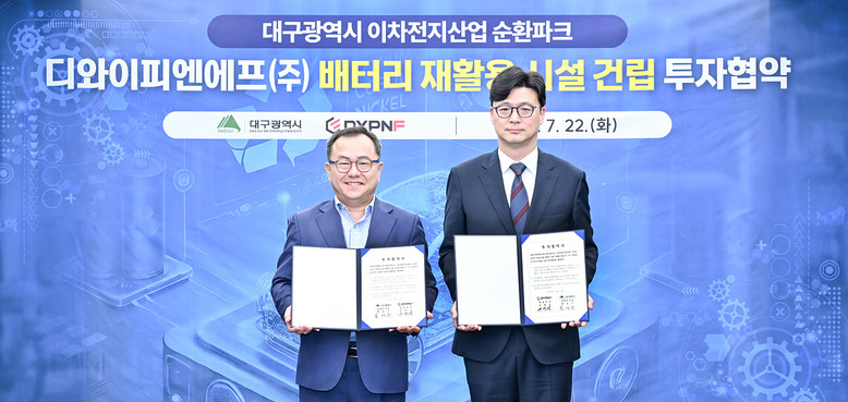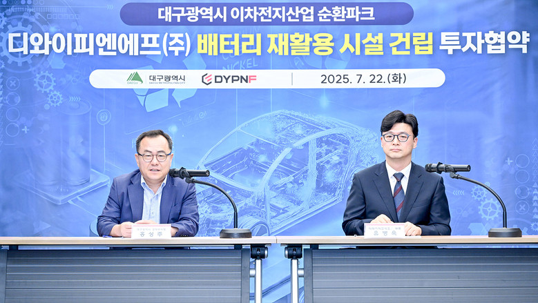 ▸ 대구시, 배터리 순환이용 생태계 구축을 위한 기반 마련 [세계타임즈=대구 한윤석 기자] 대구광역시는 7월 22일(화) 산격청사 대회의실에서 디와이피엔에프㈜(대표 유병욱)와 달성 이차전지산업 순환파크 내 ‘사용 후 배터리 재활용 공장’ 신설 투자협약(MOU)을 체결했다.