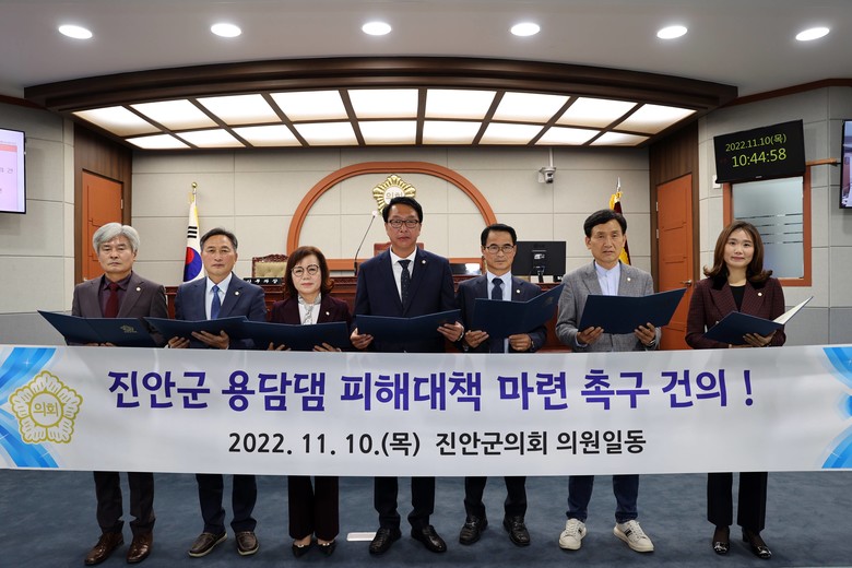 결의안을 살펴보면 진안군은 용담댐 건설로 인해 70여 개 마을 12,000여명이 삶의 터전을 상실했고, 주변은 수변구역으로 묶임에 따라 각종 행위가 제한되고 있다며 ‘지역소멸위기를 극복하고 진안군민들의 경제적 기반 마련을 촉구’하는 내용을 담고 있다.