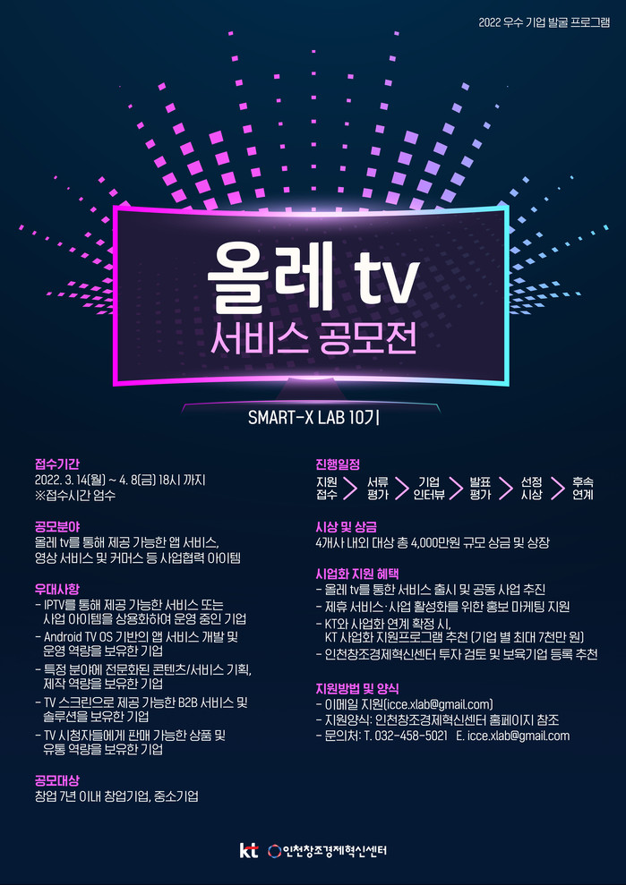 KT와 인천창조경제혁신센터가 공동 주최하는 이번 공모전은 올레 tv를 통해 제공 가능한 앱·영상·커머스 등 사업 아이템 보유 기업 모집을 위해 마련됐으며, 창업 7년 이내 창업기업 및 중소기업이면 참여 가능하다.