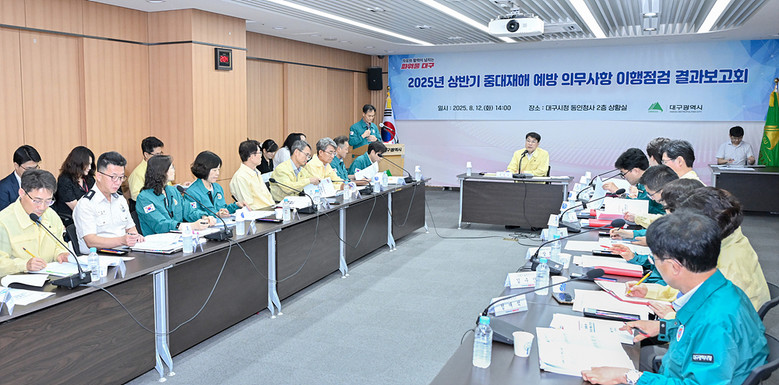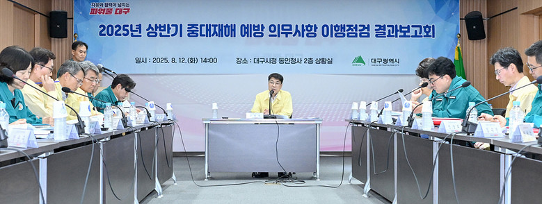 ▸ 정기적 안전 점검 및 선제적 안전조치로 안전보건관리체계 강화 [세계타임즈=대구 한윤석 기자] 대구광역시는 지난 12일(화) 오후 2시, 동인청사 2층 상황실에서 중대재해 예방 및 안전관리 강화를 위해 ‘중대재해 예방 의무사항 이행점검 결과보고회’를 개최했다.