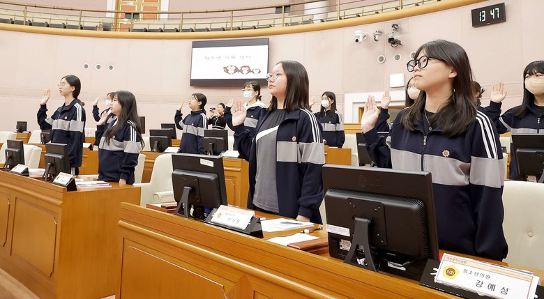 청소년 의회교실에 참여한 충남여중 학생들은 ‘여러 가지 일을 동시에 하기보다 한 가지 일에 집중하자’ 등 3건의 자유발언 발표와 2건의 안건 제안설명을 직접 진행하는 등 모의 본회의를 체험했다.
