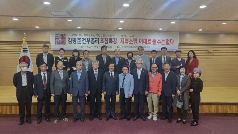 [세계타임즈 백진욱 기자] 10월 6일 《공정과 상식 회복을 위한 국민연합》의 경상북도 지역본부가 ”지역소멸 이대로 둘 수는 없다“를 주제로 김병준 전 부총리를 초청하여 경북 안동문화예술의 전당 국제회의실에서 제48차 포럼을 개최했다. 이날 포럼은 약 230여 명의 공정과 상식 포럼 회원 및 각계 지역 인사가 참석한 가운데 사회적 거리두기 지침에 따라 진행되었다.