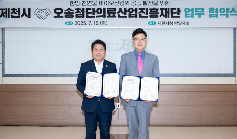 이날 협약식에는 김창규 제천시장, 이명수 오송첨단의료산업진흥재단 이사장 등 양 기관의 주요 관계자들이 참석하여 상호 신뢰를 바탕으로 지역의 전략산업인 한방천연물산업의 고도화와 국가 바이오헬스 산업 발전에 대한 기여 의지를 확인했다.