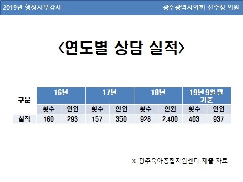 2019년 10월 말 기준, 상담건수는 매년 증가하는데, 보육교사는 7,538명 대비 상담전문요원은 고작 1명이다. 4년 동안 7,538명의 보육교직원 중, 1,374명 34.5%만이 상담 서비스를 받아본 것으로 나타났다.