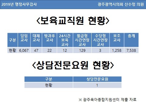 [광주=세계타임즈 손권일 기자] 광주광역시의회 신수정 의원(더불어민주당, 북구 제3선거구)은 4일 광주육아종합지원센터 행정사무감사에서 보육교직원의 직무스트레스를 줄여 아이들에게 안전하고 안정적인 보육환경을 조성하고자 배치된 상담전문요원이 부족하다고 지적했다.