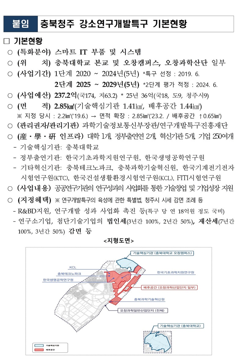 이 사업은 연구개발특구에서 창출된 전략기술 분야 혁신 성과를 지역의 주력산업과 연계하여, 지역 산업 성장을 견인할 수 있도록 지원하는 사업으로 충북대가 총괄주관연구개발기관으로 선정되어 3년간 최대 90억 원의 국비를 지원받으며, 이후 사업 성과 평가를 통해 2년간 국비를 추가로 지원받게 된다.