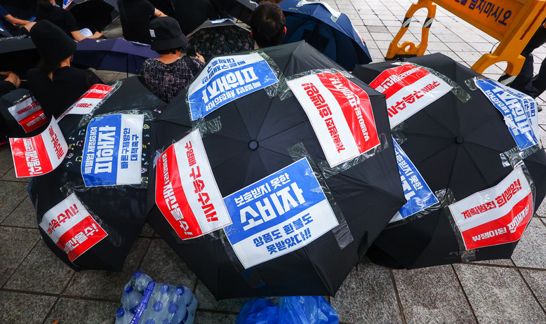 [세계타임즈 = 이송원 기자] 티몬·위메프(티메프) 정산 지연 사태 피해자들이 25일 서울 영등포구 금융감독원 앞에서 검은 우산 집회를 열고 피해자 구제 특별법 제정 등을 촉구하고 있다. 2024.8.25