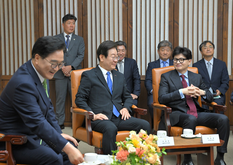우원식 국회의장(왼쪽부터), 더불어민주당 이재명 대표와 국민의힘 한동훈 대표가 2일 오후 서울 여의도 국회본청 의장접견실에서 제22대 국회 개원식을 앞두고 환담하고 있다. 2024.9.2 [국회사진기자단]