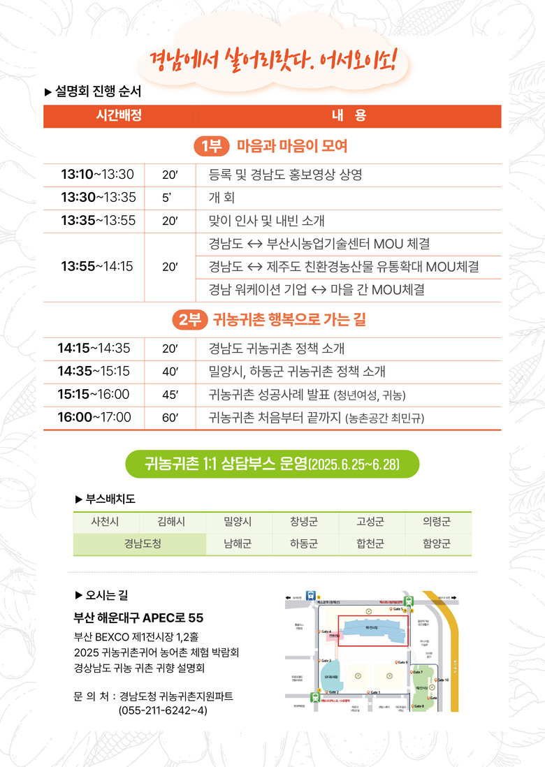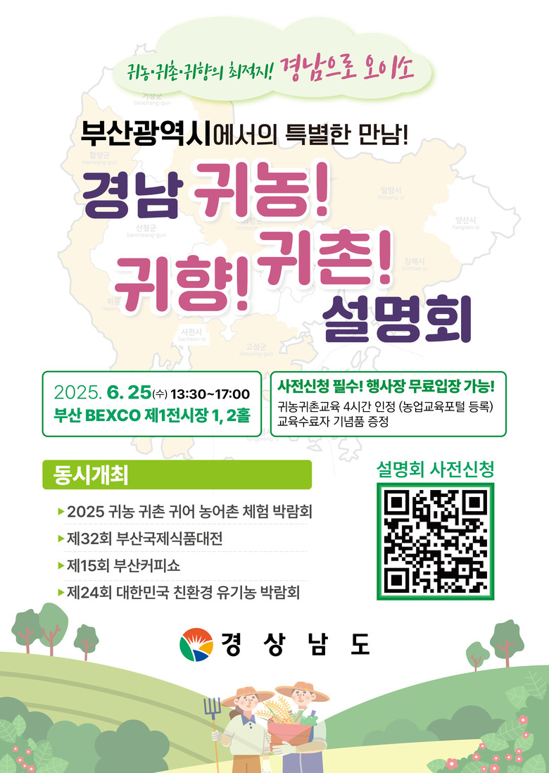 경남도 관계자는 “20일부터 22일까지 서울 aT센터에서 개최하는 ‘2025 국민팜 박람회’에 참가하여 부산에서 개최하는 경남 귀농귀촌귀향 설명회도 적극 홍보할 계획이다”라고 밝혔다.