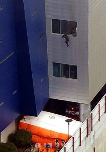 4일 오전 경기도 화성시 동탄 메타폴리스에서 화재가 발생해 시민이 창문을 통해 소방당국이 설치한 에어 매트로 뛰어내리고 있다. 소방당국은 이번 화재로 사망 4명, 경상 12명 등 총 구조인원 116명이라 밝혔다. 2017.02.04. (사진 출처=동탄맘들 모여라 카페 )