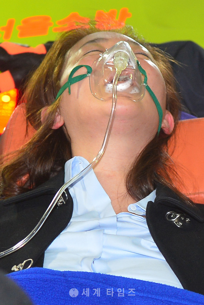 박근혜 대통령 비선진료 의혹을 받고 있는 성형외과 김영재 원장의 부인 박채윤 씨가 구속된 후 조사를 받기 위해 4일 오후 서울 대치동 특검으로 소환됐다가 얼굴이 붉어진 채 호흡곤란을 호소하며 119 앰뷸런스로 실려나가고 있다. 2017.02.04.