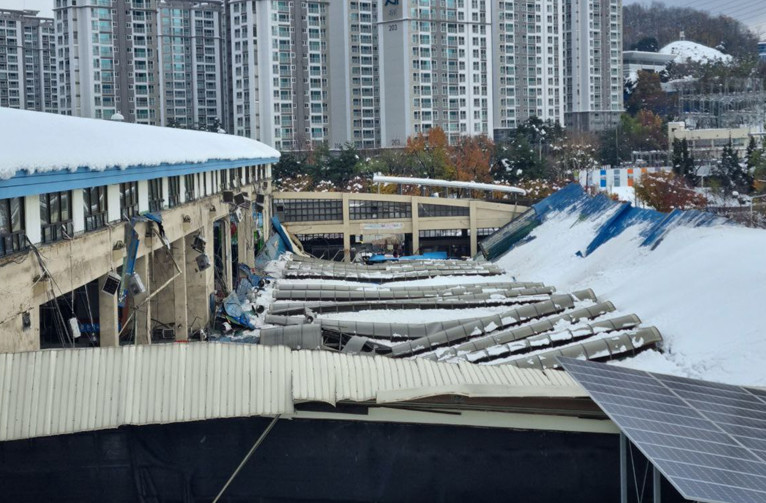 8일 오후 경기 안양시 동안구 농수산물도매시장 청과동에서 폭설로 인해 천장이 무너지며 60대 여성 1명이 다치는 사고가 났다.사진은 사고 현장. 2024.11.28 [경기도소방재난본부 제공]