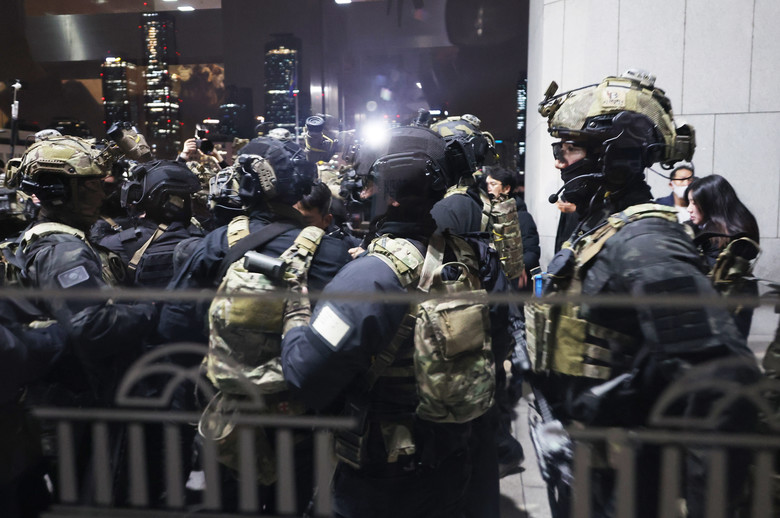 윤석열 대통령이 3일 밤 긴급성명을 통해 비상계엄을 선포한 가운데 4일 자정께 서울 영등포구 여의도 국회 본관으로 계엄군이 진입 준비를 하고 있다. 2024.12.4