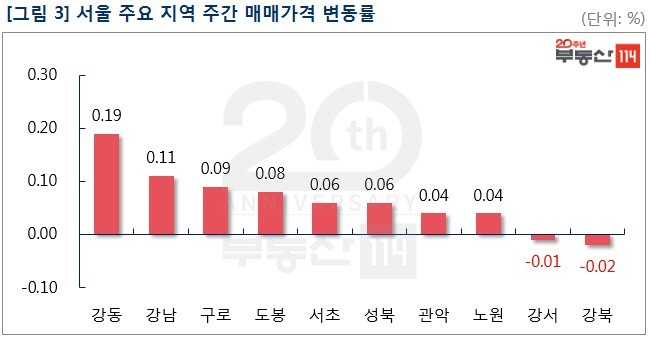 서울은 강남권 일반아파트가 가격 상승을 주도하는 가운데 △강동(0.19%) △강남(0.11%) △구로(0.09%) △도봉(0.08%) △서초(0.06%) △성북(0.06%) △관악(0.04%) 등이 올랐다. 강동은 비교적 입주연차가 길지 않은 고덕동 고덕래미안힐스테이트를 비롯해 암사동 롯데캐슬퍼스트 등이 1,000만원-2,500만원 올랐다. 강남은 개포동 디에이치아너힐즈와 대치동 래미안대치팰리스 등이 5,000만원-6,000만원 상승한 반면 재건축 추진 단지인 개포동 주공1단지는 1,000만원 하락했다. 이밖에 매수세가 부진한 ▼강북(-0.02%), ▼강서(-0.01%)는 소폭 하락했다.