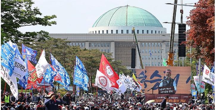 한국노동조합총연맹도 이날 오후 2시 영등포구 국회 앞에서 제134주년 세계노동절 기념 전국노동자대회를 개최했다.주최 측 추산 8천여명은 의사당대로 4개 차로에 모여 노동조합법 2·3조 개정안 재추진, 주4일제 쟁취, 최저임금 차등 적용 시도 중단 등을 외쳤다.김동명 한국노총 위원장은 지난 총선에서 국민은 정권 심판이라는 확실한 결단을 보여줬다며 윤석열 정부가 남은 3년의 임기를 채울 수 있는 유일한 길은 민심을 받들어 반노동 정책을 포기하고 국정 기조를 대전환하는 것뿐이라고 말했다.민주노총 산하 건설노조 등 5개 노조는 이날 낮 12시께부터 서대문구 경찰청 앞 등 곳곳에서 사전대회를 연 뒤 본대회에 합류했다.건설노조 장옥기 위원장은 사전 결의대회에서 양회동 열사는 강압수사에 분신으로 호소했다며 윤석열 정권은 자신의 지지율을 올리기 위해 노동 개혁이라는 이름으로 건설노조를 가장 악랄하게 탄압했다고 비판했다.건설노조는 양 씨의 분신모습이 담긴 폐쇄회로(CC)TV 영상이 언론사에 유출된 것과 관련해 서울중앙지법에 손해배상 청구 소송을 냈다고도 밝혔다.