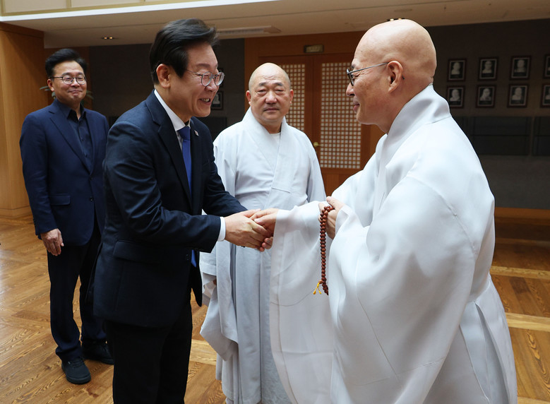 진우스님과 악수하는 이재명 대표