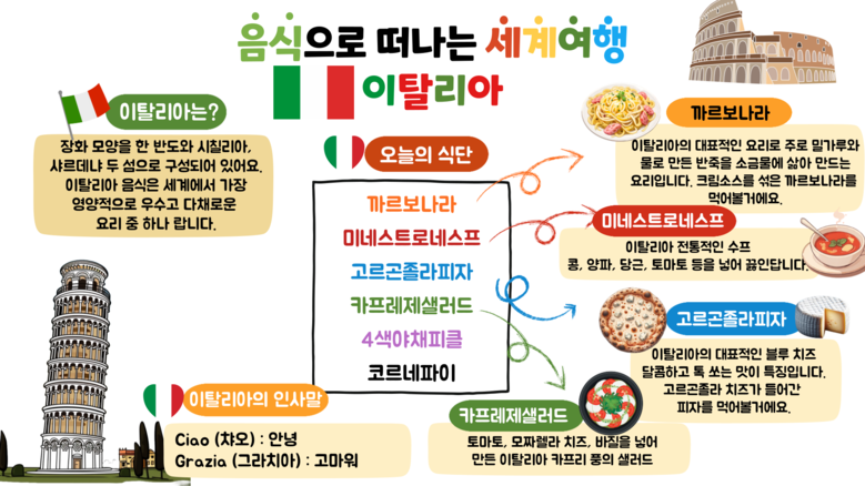 ◦이탈리아의 대표적인 음식과 유래 등 다양한 문화를 체험할 수 있도록 함