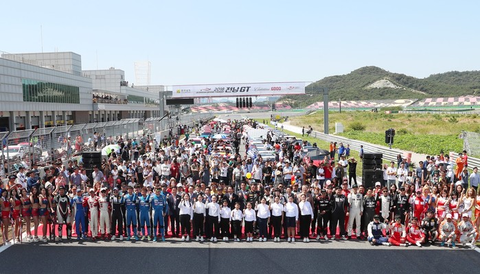 [사진설명] 지난해 코리아인터내셔널서킷에서 열린 2018 전남GT 개막식에서 참가자들이 스타트 아치를 배경으로 기념촬영하고 있다.