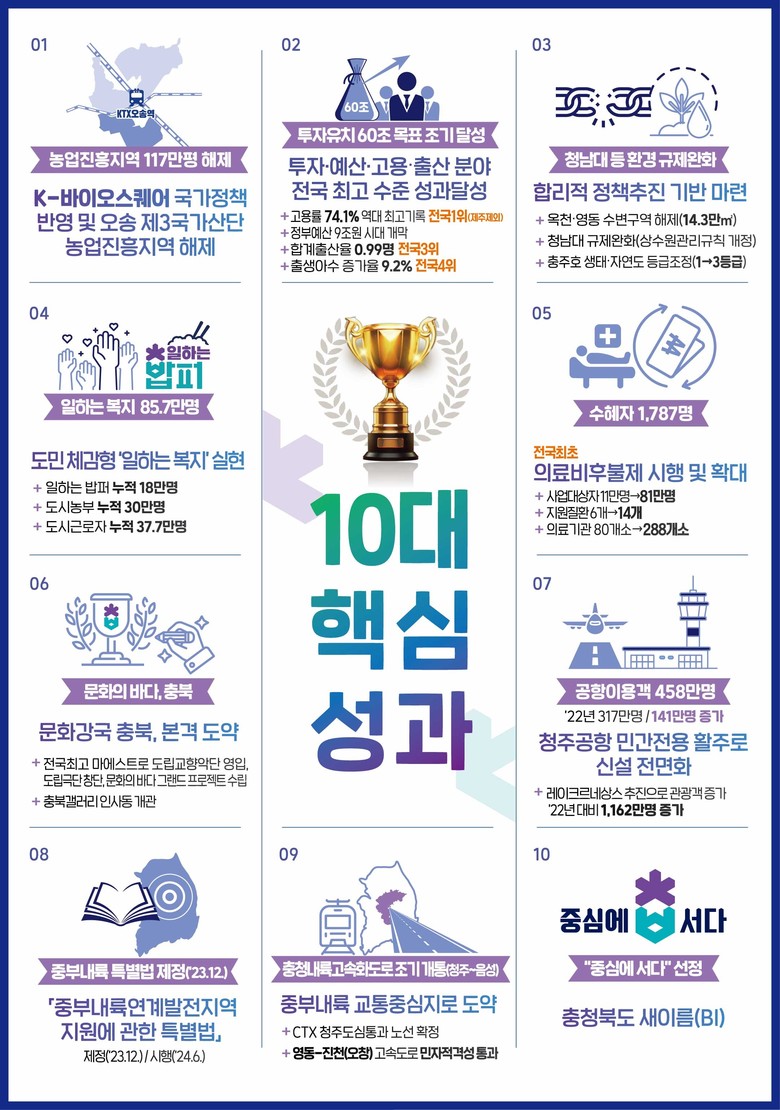 김영환 지사는 “도정의 모든 판단과 선택, 정책의 중심에는 언제나 도민이 있었다.”라고 말하며, 지난 3년의 10대 핵심성과를 다음과 같이 발표하였다.