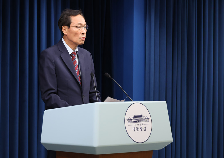 우상호 정무수석이 22일 용산 대통령실에서 이재명 대통령과 여야지도부 오찬 관련 브리핑을 하고 있다. 2025.6.22