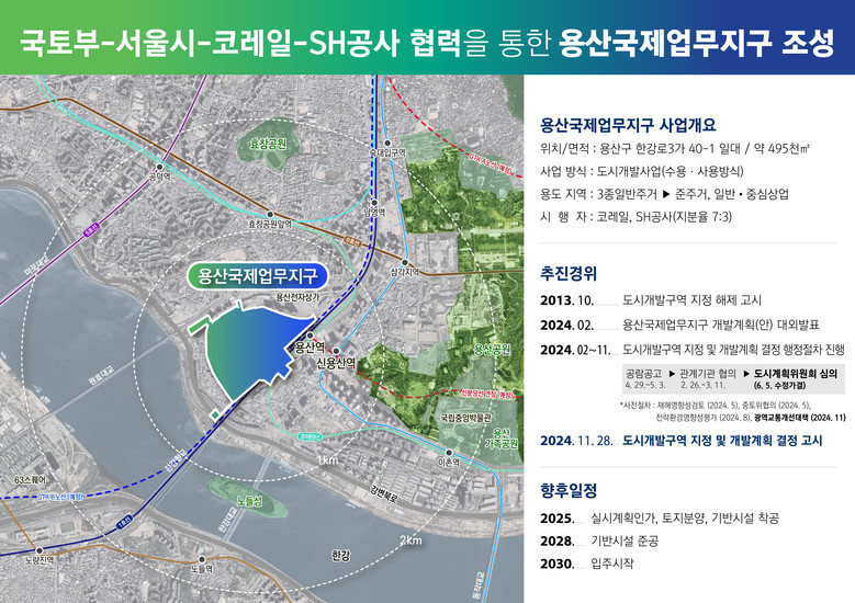 지하간선도로와 강변북로 연결도로를 신설하고 GTX-B 출입구와 환승 통로, 지행 보행로를 새로 만든다. 용산역과 공항철도도 잇는다.이를 위해 2025년 상반기 용역을 발주해 2030년부터 단계적으로 준공할 계획이다.한편, 기후환경 차원에서 제로 에너지 건축물을 조성하고 수소 연료전지를 설치한다.이밖에 인공지능(AI)과 빅데이터 기반의 자율주행 시스템과 첨단 물류시스템 도입을 추진한다.서울 중심부로 선호도도 높은 이 지역에 주택을 공급하는 차원에서 용산국제업무지구에 6천호를, 용산 전자상가 등 반경 1㎞ 이내 재건축·재개발을 촉진하고 청년 안심주택을 지어 7천호를 공급한다.이를 통해 총 1만3천호의 주거시설을 확충한다는 방침이다.글로벌 인재들이 머무를 수 있도록 거주지로서의 매력도도 높인다. 외국인 학교, 외국인 특화 의료기관, 맞춤형 주거 공간 등 영어친화형 환경을 만든다.시는 용산국제업무지구 홍보 브랜드로 용산서울코어를 선정했다. 서울의 중심을 넘어 아시아, 태평양의 중심이자 핵심으로 도약한다는 의미다.오세훈 서울시장은 협약식에서 용산국제업무지구는 대한민국의 미래 국가 경쟁력을 상징하는 공간으로, 경제를 활성화하고 도시 경쟁력을 끌어올리는 두 가지 목표를 모두 실현할 것이라며 사업이 성공적으로 추진되도록 최선을 다해 노력하겠다고 말했다.