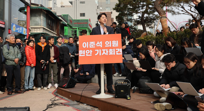 개혁신당 이준석 의원이 2일 서울 마포구 홍대 레드로드 버스킹거리에서 정치 현안 관련 기자회견을 하고 있다. 2025.2.2