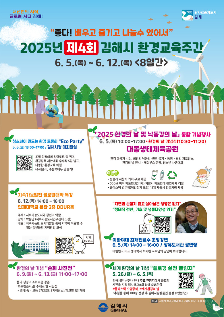 이 기간을 전후해‘좋다! 배우고 즐기고 나눌 수 있어서’를 슬로건으로 환경교육 체험, 강연, 캠페인 등 다채로운 프로그램이 김해 전역에서 진행된다.