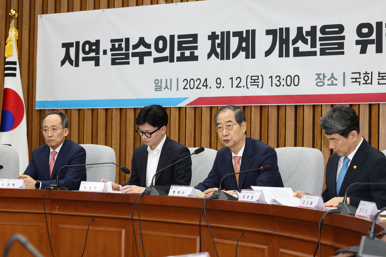 한덕수 국무총리가 12일 오후 서울 여의도 국회에서 열린 지역·필수의료 체계 개선을 위한 당정협의회에서 발언하고 있다. 왼쪽부터 국민의힘 추경호 원내대표, 한동훈 대표. 한덕수 국무총리, 이주호 부총리 겸 교육부 장관. 2024.9.12