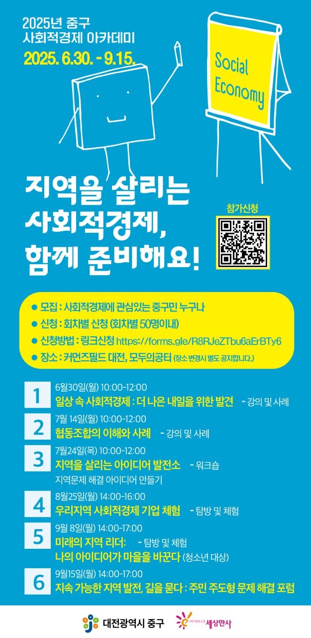 [중구 세계타임즈=이채봉 기자] 대전 중구(구청장 김제선)는 지난 30일 커먼즈필드대전 모두의공터에서 사회적경제에 관심 있는 구민을 대상으로 ‘2025년 사회적경제 아카데미’를 개최했다고 밝혔다.