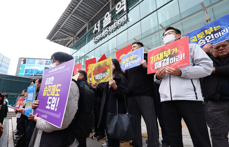 21일 서울역 앞에서 열린 전국철도노동조합 12월 총파업 돌입 예고 기자회견에서 참가자들이 손팻말을 들고 있다. 2024.11.21