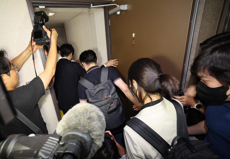 김건희 여사의 의혹들을 수사하는 민중기 특별검사팀 관계자들이 28일 서울 노원구 개혁신당 이준석 당대표 자택을 압수수색하기 위해 들어서고 있다. 2025.7.28 [공동취재]