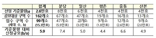 1기 신도시 162개 특별정비예정구역 중 61%에 해당하는 99개 구역이 제안서를 냈다.특별정비예정구역은 지자체가 정비기본계획을 통해 재건축이 필요한 단지 2∼4개가량을 묶어서 지정해 놓은 곳이다.선도지구 제안서를 제출한 구역의 가구 수는 15만3천가구로, 이는 1기 신도시 전체 주택 수(주택 재고) 29만가구의 53%에 이른다.주택 수로 따지든, 정비구역 수로 따지든 1기 신도시 절반 이상이 선도지구가 돼 재건축을 하겠다며 출사표를 던진 셈이다.정부는 분당 8천가구, 일산 6천가구, 평촌·중동·산본 4천가구를 합쳐 총 2만6천가구를 선도지구로 지정하겠다고 밝혔다. 여기에 신도시별로 1∼2개 구역을 추가(기준 물량의 50% 이내)할 수 있어 최대 3만9천가구까지도 지정이 가능하다.이번에 신청이 들어온 가구는 기준 물량 2만6천가구 대비 5.9배, 최대 물량 대비로는 3.9배 수준이다.
