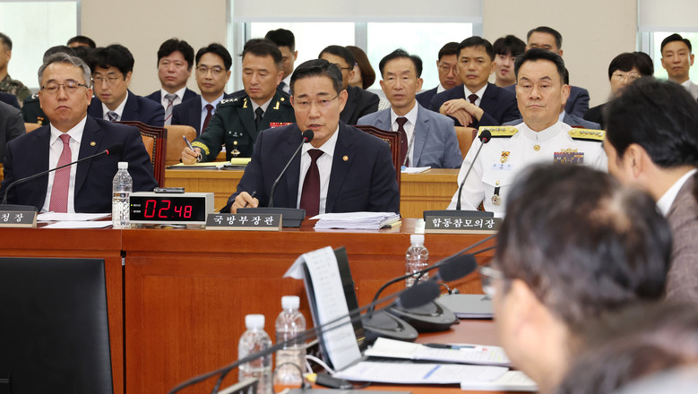 8일 오전 열린 국회 국방위원회 전체회의에서 신원식 국방부 장관(가운데)이 의원질의에 답변하고 있다. 2024.8.8