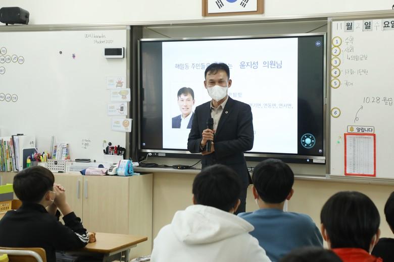 이번 찾아가는 의회교실에서는 지역구 의원인 윤지성 의원이 해밀초 나리‧마루‧라온반 학생들과 만났다. 학생들은 ‘의원과의 만남’ 시간에서 윤지성 의원에게 ‘의원이 어떤 일을 하는지’, ‘의원이 왜 되고 싶었는지’, ‘의원으로서 힘든 일은 없었는지’ 등을 질문하고 이에 대한 윤 의원의 답변을 통해 시의회의 기능과 시의원의 업무와 역할을 알아갔다.