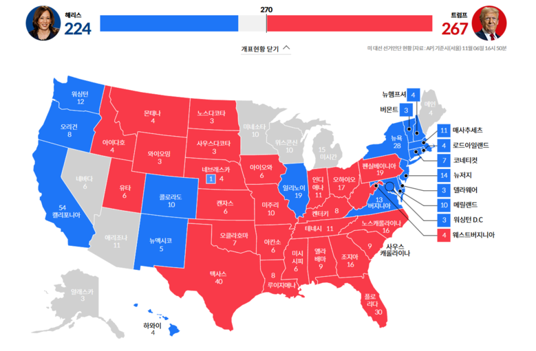 펜실베이니아 승리 결정 뒤 연설 개표 완료 후 선거인단 315명 확보 예상