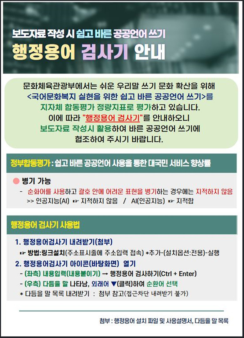 이러한 공공언어 개선 노력은 지자체 보도자료를 표본으로 추출해 공공언어 사용 실태를 평가하는 지자체 합동평가 지표 향상에도 기여할 것으로 기대된다.