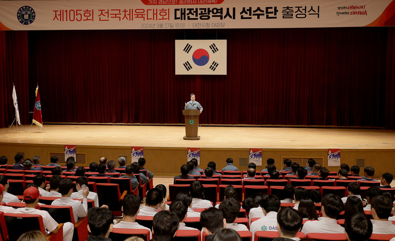 [대전 세계타임즈=이채봉 기자] 대전시의회 조원휘 의장은 27일 시청 대강당에서 열린 ‘제105회 전국체육대회 시 대표선수단 출정식’에 참석해 다음 달 11일부터 17일 개최되는 전국체육대회에 참가할 49개 종목 1,626명의 대전시 대표선수단을 격려하는 가운데, 축사를 통해 “대전시의회는 대전의 체육진흥을 위해 정책적인 지원에 최선을 다해 나갈 것”이라고 성원했다.