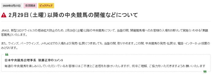 일본 중앙경마(JRA)의 경우, 연간 3,550경주를 시행하는데, 현재도 매주 주말 도쿄·교토·고쿠라 등 3개의 경마장에서 예정대로 약 70개의 경주를 시행하고 있다. 고객 이벤트를 취소했을 뿐 경마장 및 전국의 장외발매소는 동일하게 운영해왔다. 그러나 ‘코로나19’ 확산 방지를 위해 금주 29일(토)부터 ‘무관중 경마’를 시작한다. 고객 입장 없이 경마 경주만 시행하고, 전국 장외발매소 역시 운영하지 않는다. 다만 전화와 인터넷을 이용한 마권 발매는 가능하다.