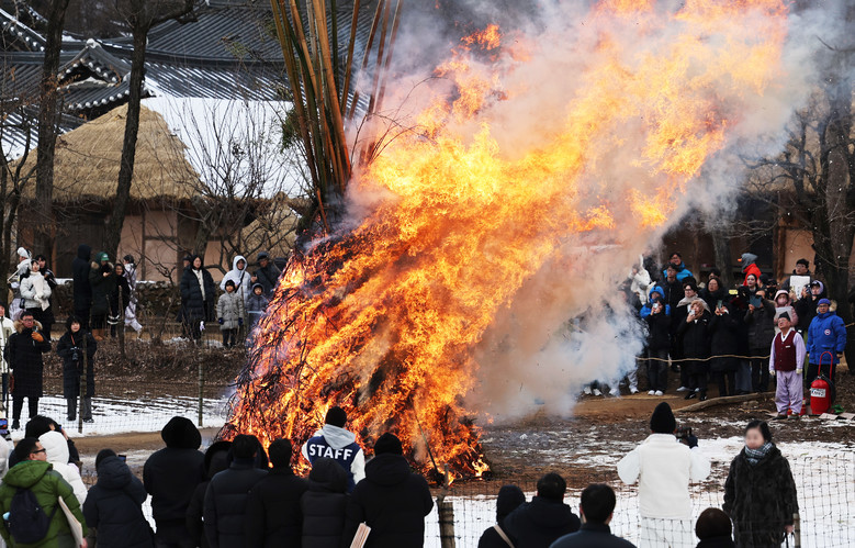 [세계타임즈 = 송민수 기자] 9일 오후 경기도 용인시 한국민속촌에서 열린 정월대보름 달집태우기 행사에서 시민들이 타오르는 달집을 바라보고 있다. 2025.2.9